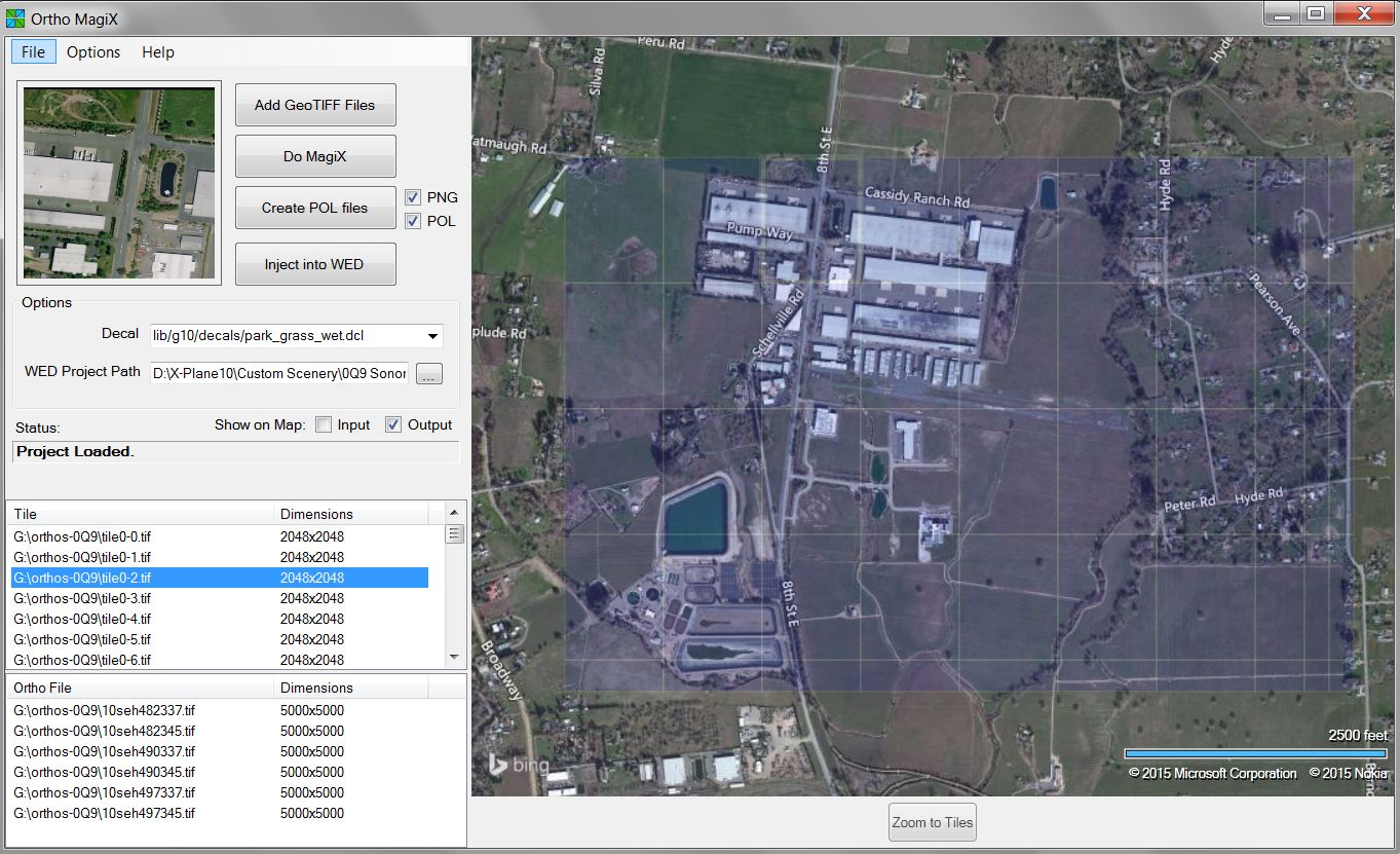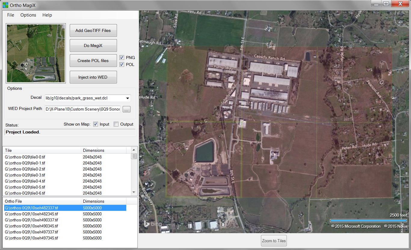OrthoMagiX transforms ortho-imagery (GeoTiff) files into a size and shape that can be used by X-Plane. It creates the tiles and the polygons (.pol files) needed by WED, and injects the overlays into WED ready for your use. You can “Export Scenery” from WED and see the results straight away, but of course you’ll want to add objects to your scenery, and perhaps edit the ortho images.